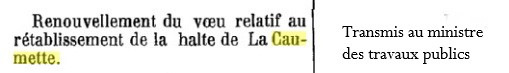 trouverait plus sur la ligne en exploitation. Étonnant, non ! A la session d'avril 1890, et même avant, le rétablissement de la halte de la Caumette est demandé...